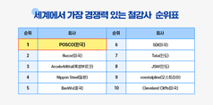 [산업경제뉴스 강민구 기자] 포스코가 12월 12일(뉴욕 현지시간) 세계적인 철강전문 분석기관 World Steel Dynamics(WSD)가 발표하는 ‘세계에서 가장 경쟁력 있는 철강사’ 순위에서 13년 연속 1위에 선정됐다. 1999년 설립된 WSD는 글로벌 철강사를 대상으로 매년 23 개 항목을 평가하고 이를 종합한 경쟁력 순위를 발표해 오고 있다. 포스코는 친환경 기술혁신, 고부가가치제품, 가공비용, 인적역량, 신성장사업, 투자환경, 국가위험요소 7개 항목에서 만점을 받으며 평균 8.5점(10점 만점)으로 종합 1위에 올랐다. 세계에서 가장 경쟁력 있는 철강사 순위표이다. 포스코(한국)가 1위, Nucor(미국)이 2위 ArcelorMittal(룩셈부르크)가 3위, Nippon Steel(일본)이 4위, baowu(중국)이 5위, SDI(미국)이 6위, Tata(인도)가 7위, JSW(인도)가 8위, voestalpline(오스트리아)가 9위, cleveland Cliffs(미국)이 10위이다. WSD의 필립 엥글린(Philipp Englin) CEO는 “포스코의 수소환원제철포럼(HyIS)이 철강업계 밸류체인 차원의 협력을 이끌어내 탄소중립을 위한 구