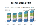 [엔트로피타임즈 강민구 기자] 국세청이 2017년 조세통계현황을 19일 조기 공개했다. 국세청은 국민들의 이해를 돕고 조세정책 수립 및 연구를 지원하기 위해 12월에 국세통계연보를 발간하지만, 국민들이 국세통계정보를 보다 신속하게 이용할 수 있도록 하기 위해 연도 중에 통계를 조기 공개한다고 조기 공개 이유를 밝혔다. 국세청 조기 공개자료에 따르면 2017년 국세는 모두 255조5932억원이 걷혔다. 2016년 233조3291억원 보다 9.5% 증가한 실적이다. 총국세 부과는 265조원이지만 그중 96.3%가 납부됐다. 세목별로는 소득세가 76.8조원으로 가장 많았으며, 부가가치세가 67.1조원, 법인세가 59.2조원으로 뒤를 이었다. 증가율을 보면법인세가 13.5%로 가장 높은 증가세를 보였고, 소득세는 전년대비 9.6%, 부가가치세는 8.5%, 증가했다. 소득의 흐름이 법인으로 몰리고 있는 구조가 심화되고 있다는 분석이 나온다. 고액상습체납 명단 공개자들에 대한 세금 징수는 3211명, 1870억원으로 전년보다 인원은 67.6%, 금액은 18.8% 증가했다. 법인세 신고법인 수는 51만3278 개로 지난해 43만9468개 보다 17% 증가했다. 부담세액은