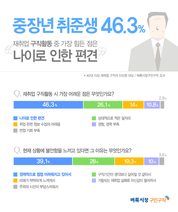 40대 이상 퇴직자 10명 가운데 9명은 경제적 이유로 일자리를 찾고 있지만 나이때문에 받는 편견을 받고 있는 것으로 조사됐다. 미디어윌(대표 장영보)이 운영하는 벼룩시장 구인구직은 22일, 퇴직한 40대 이상 중장년층 510명을 대상으로 설문 조사를 진행한 결과를 공개했다. 설문결과를 살펴보면 이전 직장에서 나온 이유는 22.5%가 ‘새로운 일을 해보고 싶어서’를 꼽았다. 다음은 퇴사 압박을 받아서가 20.4%로 나타났다. 휴식이 필요해서와 (16.9%), 만족스럽지 못한 급여 때문도 각각 16.9%, 16.7%로 비슷한 비율을 보였다. 그밖에 업무가 적성에 맞지 않아서와 여성의 경우 임신, 육아 등으로 인한 직장생활의 어려움, 상사나 동료와의 관계 악화 등의 답변도 있었다. 현재 구직활동 중인지를 묻는 질문에는 응답자 10명 중 9명이 그렇다고 답했다. 이들이 구직활동을 하는 가장 큰 이유는 경제적인 사정(76.4%)이었으며, 자아성취감을 느끼고 싶어서(11%), 시간적인 여유가 생겨서(7.4%) 등의 답변이 뒤를 이었다. 또, 재취업 활동 시 가장 큰 걸림돌은 절반에 가까운 46.3%의 응답자가 나이로 인한 편견을 꼽았다. 상대적으로 적은 일자리라는 답