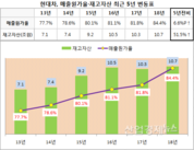 [산업경제뉴스 김소산 기자] 현대자동차의 재고자산이 급증하고 있다. 현대차의 지난해 말 재고자산(연결기준)은 10.7조원으로 5년 전인 2013년도 보다 51.5%가 증가된 것으로 나타났다. 이는 판매량 감소가 원인으로 파악되고 있다. 재고자산은 완성품인 제품과 미완의 반제품 등으로 나눠지는데 현대차의 경우 완제품 잔액이 61%를 차지하고 있다. 이에 따라 증가된 재고는 차량재고로 봐도 무방하다는 게 업계의 중론이다. 산업경제뉴스가 현대차의 재고를 조사해 봤더니 5년 전인 2013년 잔액이 7.1조원이었다. 하지만 이듬해 7.4조원에서 점증하기 시작해 지난해에는 10.7조원까지 치솟으며 5년 새51.5% 확대됐다. 같은 기간 글로벌 차량판매 수량은 2013년 473만대에서 지난해 459만대로 거꾸로 14만대가 줄었다. 이번에는 판매량을 최근 2년간으로 축소했더니 더 악화된 수치가 나왔다. 2016년 486만대에서 지난해 459만대로 2년 만에 27만대 감소했다. 판매부진이 재고확대의 주범이라는 주장에 힘이 실리는 이유다. 회계전문가들은 재고가 확대되면 매출원가율이 상승하고 이는 또다시 수익성 악화로 이어진다고 설명하고 있다. 이를 확인하기 위해 현대차의 매출