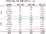 [산업경제뉴스 김소산 기자] 현대자동차, 기아자동차, 한국지엠, 르노삼성자동차, 쌍용자동차로 대표되는 국내 완성차 5사의 지난달 판매량은 –5.8%의 부진을 보이며 4개월 연속 마이너스 성장으로 마감됐다. 월별로 보면 1월에 기저효과에 힘입어 9.5% 증가한 후, 2월 –24.8%, 3월 –2.5%, 4월 –6%를 보였고 5월도 낙폭을 줄이지 못한 채 부진을 이어갔다. 지난달 완성차 5사의 총 판매량은 66만4200대로 지난해 같은 달 70만5120대 보다 5.8% 줄어든 것으로 집계됐다. 이에 따라 전년 대비 지난 1분기에서도 –2.8% 보인 실적이 2분기에도 울상을 지어갔다. 업체별 증감률은, 지난해 12월을 제외하고는 7월부터 4만대 미만을 맴돌던 한국지엠이 지난달 판매량 4만1천대에 올라서며 0.4% 증가, 반전에 성공했다. 반면, 대내외 악재로 고전하고 있는 르노삼성은 11.6%, 현대차 7.7%, 쌍용차 4.6%, 기아차 3.5% 순으로 부진했다. 부분별로 보면 내수에서 13만3719대, 수출포함 해외부문에서 53만481대가 팔려 내수에서는 ‘0’% 보합을 나타냈으나 해외부문이 7.2% 줄면서 전체 실적을 끌어내렸다. 내수에서는 현대차가 9.5%