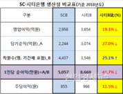 [산업경제뉴스 김소산 기자] SC제일은행의 지난해 1인당 순이익(5057만 원)이, 같은 외국계 시중은행인 한국시티은행(8669만원)의 58%에 불과한것으로 것으로 나타났다. 두 외국계 은행이 지난달 제출한 사업보고서에 따르면, 2018년 말 자산규모는 SC 65.1조원, 시티 45조원으로 SC가 약 30% 많았다. 하지만, 당기순이익은 시티은행이 3074억 원으로, SC은행(2244억 원) 보다 27% 많이 거뒀던 것으로 나타났다. 이에 두 외국계은행의 생산성 비교를 위해 1인당 순이익을 봤더니,SCB는 5057만원으로시티B 8669만원의 58%수준(42%↓)에 불과했던 것으로 산출됐다. 뿐만 아니다. 주당순이익에서도 시티은행은 966원으로 SC 855원 보다 11.7% 많았던 것으로 분석됐다. ■ 지난해 당기순익 성장률,전년比 씨티 26.1%↑vs SC 19.1%↓ 지난해 당기순익은 씨티B가 전년보다 26.1%가 증가한 반면, SC는 19.1%가 줄어 희비가 엇갈렸다. 게다가, 지난 연말 기준 SC는 시티B보다 25.1% 많은 4437명의 직원을 거느리고 있었다. SC가 직원수에서 시티B 보다 1/4이나 더 많음에도, 당기순익 규모에서는시티에 비해 오히려