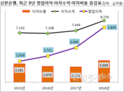 [산업경제뉴스 김소산 기자] 신한은행의 최근 3년간 영업이익이 87% 증가해서 2배 가까이 늘어난 것으로 나타났다. 신한금융지주가 지난달 홈페이지를 통해 발표한 신한은행의 지난해 경영실적을 보면, 영업이익 2조8350억 원, 당기순익 2조1170억 원으로 전년보다 각각 38.7%, 31.6% 늘어났다. 산업경제뉴스가 신한은행의 최근 3년간 실적을 분석해 본 결과, 영업이익과 당기순이익은 3년 전 보다 각각 87%, 74% 증가한 것으로 조사됐다. 이러한 성과의 주요인은, 예금이자는 적게 주고 대출이자는 많이 받은 것이 주효했던 것으로 분석됐다. 이에따라 주당순이익은 3년 전인 2015년 731원에서 지난해 1319원으로 80.4% 늘었고, 같은 기간 총자산도 269조원에서 324조원으로 20.4% 확대됐다. 주당순이익의 기반인 당기순이익이 3년 동안 74.0% 늘어났기 때문인데 이러한 증가는 이자수입 증가가 주요 요인인 것으로 분석됐다. 고객으로부터 징구하는 이자수익은 2015년 7조1520억원에서 2018년 8조7260억 원으로 22% 증가했다. 반면, 같은 기간 고객에게 지급하는 이자비용은 3조2810억원에서 3조6960억원으로 12.6% 증가에 그쳤다.