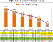 [산업경제뉴스 김소산 기자] 현대자동차의 당기순이익률이 5년 새1/6토막이 나면서 '나락'으로 떨어지고 있다. 현대차는 1월말 홈페이지를 통해, 지난해 매출액 97.3조원, 영업이익 2.4조원, 당기순이익 1.6조원을 기록했다고 발표했다. 지난해 실적을 직전 년도인 2017년과 비교해 보면, 매출액은 0.9%가 늘어난 반면, 영업이익과 당기순이익은 각 각 47.1%, 63.8%나 감소해 폭락하는 모습을 보였다. 영업이익은 2012년 8조4406억 원을 정점으로 이듬해부터 6년 연속 감소해서 지난해에는 2.4조원으로 주저앉았다. 새로운 회계기준 IFRS 도입이후 처음으로 3조원을 밑도는 수준까지 추락했다. 당기순이익도 2012년 9.6조원을 정점으로 지난해 1.6조원까지 매년 추락하면서5년 만에 1/6토막이 났다. 이 실적은 5년 전인 2013년과 비교할 때,영업이익은 70.9%가 감소한 실적이며, 당기순익은 이보다 더 큰 81.7%가 감소한 실적이다. 수익성 급감은 영업이익률과 당기순이익률에서도 잘 나타나 있다. 영업이익률은 2013년 9.5%에서 2018년 2.5%까지하락세를 이어가면서 7%포인트 줄었다. 같은 기간 당기순익률은 이보다 더 악화된 모습을 보