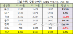 [산업경제뉴스 김소산 기자] 부산은행, 대구은행, 경남은행, 광주은행, 전북은행, 제주은행으로 대표되는 지방은행들의 지난 3분기(누적) 기준,주당순이익(이하, 순이익)이 1년 전 같은 기간보다 6.2% 늘어난 것으로 조사됐다. 주당순이익은 당기순이익을 주식수로 나눈 값으로, 주로 수익성 관련 경영성과 지표로 활용된다. 산업경제뉴스가 국내 지방은행들의 지난해 3Q 순이익을 조사해 본 결과, 6개 지방은행의평균순이익은 1695원으로 직전년도(1597원) 보다 6.2%(98원↑) 증가한 것으로 나타났다. 은행별로는, 전북은행이 1년 전에 비해 60.3%가 늘어 가장 높은 성장세를 구가했고, 이어서 부산은행 29.9%, 광주은행 10.3%, 대구은행 3.2% 순으로 증가했다. 반면, 같은 기간 경남은행은 -19.6%, 제주은행 –6.9%로 실적대조를 보이며 부진을 나타냈다. 실적증가 관련, 부산은행은 이자이익 확대와 대손비용 감소 영향으로, 전북은행·광주은행은 대출을 줄였음에도 이자이익에서 높은 성장세가, 대구은행은 보수적 대손충당금 전입비용 등을 선제적 반영 탓에 소폭 증가한 것으로 전해졌다. 반면, 경남은행은 대손비용 증가와 순이자마진(NIM) 하락영향으로 줄었