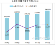 [산업경제뉴스 김소산 기자] 지난달 국내에서 팔린 수입승용차는지난해 같은 달 보다 0.5%가 늘어난2만2387대로 집계돼 전년수준의 판매량을 회복한 것으로 나타났다. 수입차 판매량은2017년 12월부터 불거진 BMW 화재사건 보도이후,지난 3월(2만6402대)을 정점으로 6개월 연속 하락추세를 이어갔다. 이후지난 9월 최저점인 1만7222대를 기점으로10월부터 지난달까지 두달 연속 판매량 2만대 이상에 올라서면서 지난해 같은달(2만2266대) 수준을 회복한 것으로 나타났다. 한국수입자동차협회는 5일 지난달 수입차 등록대수가 직전월 10월(2만813대)보다 7.5% 증가한 2만2387대, 11월까지 누적판매량은 24만255대로 집계됐다고 발표했다. 브랜드별로는 메르세데스 벤츠 7208대, BMW 2476대, 폭스바겐 1988대, 렉서스 1945대, 도요타 1928대로 1천대 이상 판매명단에 이름을 올렸고, 이어서 혼다 961대, 포드 854대, 볼보 731대, 크라이슬러 714대, 랜드로버 644대, 아우디 632대, 미니 592대로 500대 이상을 팔았고, 닛산 406대 등 7개 브랜드가 100대 이상을, 이어서 푸조, 롤스로이스, 람보르기니 순으로 팔려나갔