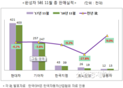 [산업경제뉴스 김소산 기자] 현대자동차, 기아자동차, 한국지엠, 르노삼성자동차, 쌍용자동차로 대표되는 완성차 5사의 지난달 총 판매량은 지난해 같은 달 보다 5.0% 마이너스 성장을 한 것으로 나타났다. 부문별 성장률은 내수 – 0.3%, 해외(수출포함) -6.0%를 기록해 전체적으로 –5.0% 로 11월을 마감했다. 업체별 내수판매는 쌍용차가 직 전월인 10월 25.0% 증가에 이어 지난달에도 17.8%가 늘어 가장 높은 성장세를, 르노삼성은 9월과 10월 각각 –34.6%, -5.4% 감소세에서 지난달 1.3% 플러스 반전에 성공했고 이어서 현대차가 0.4% 증가해 뒤를 따랐다. 반면, 한국GM은 지난 2월부터 8개월 연속 감소세에서 10월에 직전년도 추석연휴(10월)에 의한 15.9% 반짝 성장을 보인 후, 지난달 19.9%가 줄어 또다시 하락추세를 이어갔고, 기아차가 –0.7%로 뒤를 이었다. 특징은, 보합수준의 내수판매와는 달리, 수출(해외 판매포함)에서는 완성차 5社 모두 하락세를 면치 못했다. 업체별로는 르노삼성이 10월 –21.9% 이어 지난달 –41.6%로 낙폭을 키워갔고, 쌍용차 –14.2%로 두 자리 감소를, 이어서 한국GM –5.8%,