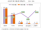 [산업경제뉴스 김소산 기자] 현대자동차, 기아자동차, 한국지엠, 르노삼성자동차, 쌍용자동차로 대표되는 완성차 5사의 지난달 총 판매량은 지난해 같은 달 보다 3.0% 성장 한 것으로 나타났다. 부문별로는 내수 23.8% 증가, 해외(수출포함) -1.0%를 기록해 전체적으로 3.0% 증가로 10월을 마감했다. 내수증가에 대해 완성차 5사는, 추석연휴가 지난해에는 10월이었으나 올해는 9월로 인해 연휴기간이 상대적 증가만큼의 성장세가 반영됐다고 분석했다. 업체별 판매순위는 쌍용차가 직 전월인 9월 –2.6에서 지난달 25.0% 증가하면서 가장 높은 성장세를 기록했고, 한국지엠이 GM사태 이후 8개월 연속 마이너스 성장에서 지난달 15.9% 플러스로 돌아섰다. 이어서 기아차 4.2%, 현대차 0.9% 성장했으나 르노삼성은 지난달 -5.4%를 기록해 9월 –34.6%에 이어 유일하게 감소세를 이어갔다. 내수 성장은 완성차 5사 모두 두 자리 수를 나타냈으나, 르노삼성만 7.8%로 한자리 수 성장했다. 순위별로는 쌍용차가 36.0%로 성장세 Top에, 이어서 지난달 –12.1%를 기록했던 현대차가 25.1% 늘어 뒤를 따랐고, 르노삼성 23.9%, 기아차 22.9%,