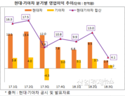 [산업경제뉴스 김소산 기자] 현대·기아자동차의 지난 3분기 영업이익이 4062억원에 그치며 두 회사의 합산 영업이익율이 1.1%까지 추락했다. 이는 약 1년전(지난해 2분기 1조7485억원)대비 1/4토막에도 못 미치는 실적으로 '날개 없는 추락' 행진을 지속하고 있다. 게다가 미국의 트럼프행정부와 중국과의 무역전쟁 불똥여파로 세계적인 소비둔화는 물론 환율불안 뿐 아니라 중국 경제성장률까지 내리막길을 걷고 있어 판매부진과 수익성이 더욱 악화되는게 아니냐는 우울한 미래가 전망되고 있다. 최근 현대기아차는 3분기 영업이익(연결기준)에서 현대차 2889억 원, 기아차 1173억 원의 실적을 발표했다. 이는 지난해 3분기와 비교해서 현대차는 75% 폭락을, 기아차는 같은 기간 4270억 원 적자에서 1173억 원으로 흑자전환에 했다. 그러나두 회사 합산 실적으로는 7772억 원에서 4062억 원으로 1년만에 반토막(48%↓) 수준을 나타냈다. 두 회사의 영업이익률 하락추세는 과거를 거슬러 가보면 더욱 가파르고 지속적이였다. 현대차의 영업이익률은 2012년 10%로 비교적 양호한 편이었으나 2013년 9.5%로 감소한 이후 하락세를 지속, 지난해에는 4.7%로 추락했