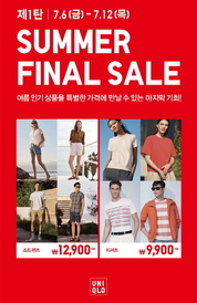 [산업경제뉴스 김소산 기자] 패션 브랜드 유니클로가 여름 인기상품을 특별한 가격에 선보이는 세일에 들어갔다. 유니클로는 오는 26일까지 무더운 여름철 쾌적함을 더하는 인기 상품을 특별한 가격에 선보이는 ‘썸머 파이널 세일'을 진행한다고 6일 밝혔다. 3주간 진행되는 이번 세일은 매주 프로모션 상품을 다르게 구성해 풍성하고 다양한 혜택을 제공한다. 6일부터 12일까지 진행되는 1차 프로모션에서는 움직임을 자유롭게 하는 대표적인 캐주얼 상품들을 선보인다. 고품질 소재와 깔끔한 디자인의 남성용 ‘스트라이프 크루넥 티셔츠’는 50% 이상 할인한 9900원에, 한 장으로도 스타일을 완성할 수 있는 여성용 ‘U 크루넥 티셔츠’는 3천원 할인된 9900원에 만나볼 수 있다. 또한 대표적인 여름 소재로 만들어 통기성이 뛰어난 남성용 ‘리넨 코튼 스탠드칼라 셔츠(긴팔)’와 ‘드라이 시어서커 셔츠(반팔)’ 모두 정상가에서 1만원 할인한 1만 9900원에 제공한다. 스타일과 기능성을 모두 갖춘 하의 상품에서는 100% 면 소재로 편안한 착용감의 남성용 ‘치노 쇼트 팬츠’와 가벼운 착용감으로 여름철 베스트셀러로 등극한 ‘감탄 쇼트 팬츠’는 모두 정상가에서 1만원 할인한 1만990