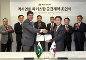 현대자동차가 파키스탄에 대형트럭 엑시언트를 대규모 공급한다. 현대차는 지난 9일 양재동 본사에서 상용수출사업부 이인철 전무, 파키스탄 현대차 상용 대리점 '알하즈 현대'의 빌랄 사장 등이 참석한 가운데 대형트럭 엑시언트 200대 공급 계약을 체결했다고 10일 밝혔다. 이는 현대차가 올해 1월 파키스탄에 진출한 이래 체결한 공급계약 중 최대 규모로 이번에 전달되는 엑시언트 200대는 트랙터 100대, 덤프 50대, 카고 50대 등이다. 업계에서는 파키스탄 자동차 시장에 진출한지 1년도 채 되지 않은 상황에서 고가 차량인 대형트럭을 200대나 공급하게 된 것은 파키스탄 내 현지 고객이 현대차의 품질 우수성과 상품 경쟁력을 높게 평가하고 있다는 방증이라고 분석했다. 현대차는 ‘중국·파키스탄 경제회랑’에 따라 경제 개발 사업이 한창 진행중인 파키스탄 지역 인프라 건설 현장에 차질이 없도록, 내년 초부터 엑시언트 생산에 들어가 내년 중에 모두 인도할 예정이다. 특히 파키스탄의 열악한 현지 도로 사정을 감안해, 높은 내구성을 가질 수 있도록 고품질의 현지 맞춤형 차량을 제공한다는 계획이다. 또한 최고의 제품 성능에 걸맞은 서비스 품질을 제공하기 위해, 차량 공급 완료