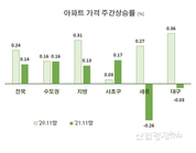 [산업경제뉴스 문성희 기자] 정부가 아무리 강력하게 규제를 해도 지난 7년 동안 오르기만 하던 아파트 가격이 드디어 떨어졌다. 아파트가격은 그동안 정부의 규제정책이 나올 때 잠시 상승폭을 줄이거나 주춤할 뿐이었는데, 11월 들어 세종시 아파트 가격이 떨어지더니 11월 마지막 주에는 대구도 마이너스 성장률을 기록했다. 물론 기타 지역은 상승폭을 줄였을 뿐 아직은 여전히 가격이 오르고 있는 중이다. 하지만 1년 전 11월 마지막 주 전국 주간 상승률이 0.24% 였던 것에 비하면 올해 11월 마지막주에는 0.14%로 상승세가 크게 꺾인 모습이다. 시장에서는 그동안 가격이 너무 오른데다, 대출규제와 금리인상까지 맞물리면서 이제 하락세가 시작되고 있다는 분석이 나오고 있다. 하지만 다른 한편에서는, 내년 대선을 앞두고 여야 대선 후보가 모두 주택 공급 활성화 정책을 내놓고, 부동산 관련 세제까지 완화하고 있어 언제 다시 상승세가 확대될 지 알 수 없다는 목소리도 나온다. 한국부동산원의 부동산 데이터를 분석해 보면 올해 11월 29일 현재 전국 아파트가격 주간 상승률은 0.14%로 지난해 11월 0.24%보다는 확실히 축소된 모습이다. 지역별로 보면, 수도권은 0.1