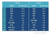 [엔트로피타임즈 최기훈 기자] 올해 시공능력 평가에서 삼성물산이 6년 연속 1위를 차지했다. 이어서 현대건설, 대림산업, GS건설, 대우건설 등이 상위에 랭크됐다. 지난해와 비교하면 1~3위까지는 순위변동이 없고 GS건설과 대우건설이 4, 5위 순서를 바꿨으며 포스코와 현대엔지니어링도 6, 7위 순서를 바꿨다. 또, 올해는 호반건설이 처음으로 10위 안에 진입하면서 지난해 9위였던 SK건설이 10위권 밖으로 밀려났다. 국토교통부가 29일 '2019년 시공능력 평가' 결과를 발표했다. 시공능력평가는 건설공사 실적과 경영상태, 기술능력, 신인도를 종합 평가해서 이를 금액으로 환산한 수치이다. 삼성물산은 시공능력평가액(=시평액)이 지난해보다 1290억원 늘어난 17조5152억원으로 평가됐다. 현대건설은 지난해보다 1조3600억원이 줄어든 11조7372억원으로 평가됐다. 10위 안에 든 건설사 가운데 가장 큰 폭으로 시평액이 줄었다. 3위를 차지한 대림산업은 1조6300억원이 늘어난 11조42억원으로 평가됐으며 4위 GS건설은 10조4052억원으로 평가됐다.GS건설은 평가액이 2조4800억원이나 늘어나 10위 안의 건설사 가운데 시평액이 가장 많이 늘었다. 5위를