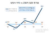 [엔트로피타임즈 문성희 기자] 최근 최저임금 인상으로 중소·자영업자들의 고통이 커지면서 문재인 정부가 추진하고 있는 '소득중심 성장'의 기조가 흔들리는 모습을 보이고 있다. 김동연 경제부총리겸 경제기획원장관은 21일 국회에서 최저임금 정책과 주 52시간 정책에 대해 속도조절을 해야한다고 말해 소득중심 성장 정책에 대한 수정 가능성을 암시했다. 하지만 우리 사회에서는 여전히 대기업 중심의 우리 경제구조에 대한 비판과 우려가 사라지지 않고 있다. 특히 이명박, 박근혜 정부 10년 사이 대기업과 근로자, 그리고 대기업과 중소기업 간의 격차가 심화되면서 저성장과 경제침체의 주요 원인으로 지목되고 경제구조의 틀을 조정해야한다는 목소리가 여전히 힘을 받고 있다. ■ 최근 5년, 상장사 영업이익증가율 69%, 근로자 명목임금 증가율 13% 이러한 목소리가 나오는 이유는, 과거 정부가 펼쳐 온 대기업 위주의 경제정책으로 국민의 대부분을 차지하는 근로자, 자영업자, 중소상공인의 삶이 갈수록 어려워지기 때문이다. 실제로 상장사들의 최근 5년 영업이익 증가율은 69%에 달하는 반면, 근로자의 임금 인상률은 같은 기간 13%에 그치고 있다. 최근 반도체 부문의 이익증가로 기업 이