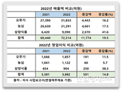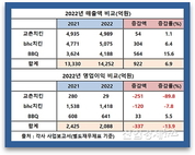 [산업경제뉴스 민경종 기자] bhc, 교촌, BBQ 등 치킨 프랜차이즈 빅3(외형 기준)의 지난해 영업실적을 분석한 결과 3위 BBQ치킨이 3사 중 유일하게 외형과 손익증가율 모두 성장해 가장 알찼던 것으로 나타났다. 3사 모두 거의 동일한 영업환경임에도 불구 각 사별로 희비가 엇갈린 것인데, 외형은 3사 모두 성장세를 일궈냈으나 손익에서는 글로벌 인플레 현상 심화에 따라 원재료 가격이 급등, BBQ를 제외하고 2사는 모두 역신장하는 부진한 성적표를 내밀었다. 먼저 개별 매출(별도재무제표)에서는 업계 3위 BBQ가 전년 대비 15.6%가 늘어 6.4%를 시현한 bhc치킨과 1.1% 성장에 그친 교촌을 따돌리고 가장 좋은 외형 성장을 시현했다. 영업이익 증가율 또한 3위 BBQ치킨이 전년대비 5.5%를 기록, bhc치킨의 –7.8%, 교촌치킨의 –89.8%를 모두 따돌리고 톱을 차지했고, 특히 교촌치킨은 전년대비 무려 89.8%나 급감해 그 원인이 무엇인지 궁금증을 유발시켰다. 아울러 bhc치킨은 기존 외형 1위 교촌치킨을 약 86억 원 가량 앞서, 업계 1위로 등극하는 지각변동을 일으켜 시선을 모았다. 그렇다면 이들 3사의 지난해 매출과 영업이익 성적표는 구