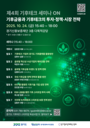 [산업경제뉴스 민경종 기자] 경기도가 주최하고 경기환경에너지진흥원, 경기창조경제혁신센터가 공동 주관하는 ‘2025 경기도 기후테크 컨퍼런스’(10.23.~10.24.)가 경기도를 기후경제 대전환의 중심지로 도약시키기 위한 구체적인 전략을 제시한다. 특히 이번 컨퍼런스의 핵심 부대행사인 ‘기후테크 세미나’를 통해 ‘기후금융과 기후테크의 투자·정책·시장 전략’을 심층 논의하며 기후테크 기업의 실질적 성장을 견인할 계획이다. ■ ‘기후경제 비전’ 선포와 ‘협력 얼라이언스’ 출범 우선 10월 24일 개막식에서는 경기도의 ‘기후테크 비전 선언’이 진행된다. 경기도는 이 자리에서 ‘2026년까지 기후테크 스타트업 100개사 육성’, ‘2030년까지 3개 유니콘 기업 육성’ 목표를 제시하며 기후경제 선도지역으로의 의지를 다진다. 또한 경기도와 공공기관, 대기업, 투자사, 기후테크 기업 등 총 20개 기관이 참여하는 ‘경기도 기후테크 얼라이언스’ 협약식도 열린다. 이 협약을 통해 참여 기관들은 기후테크 산업 육성을 저해하는 규제 개선부터 투자 유치, 실증 사업 연계까지 전방위적인 협력 체계를 구축하고, 기업 성장의 ‘플레이 그라운드’를 조성할 예정이다. ■ 심층 논의의 장