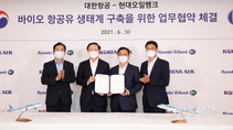 [산업경제뉴스 박진경 기자] 현대오일뱅크(대표 강달호)와 대한항공(대표 우기홍)이 친환경 연료를 활용한 항공 운송 확대를 위해 손잡았다. 두 회사는 30일, 서울 강서구 대한항공 본사에서 ‘바이오항공유 제조 및 사용 기반 조성 협력을 위한 양해각서’를 체결했다고 밝혔다. 체결식에는 강달호 현대오일뱅크 사장, 우기홍 대한항공 사장 등이 참석했다. 향후 바이오항공유 확보가 반드시 필요한 대한항공과 화이트 바이오 사업 진출을 적극 추진 중인 현대오일뱅크의 니즈가 부합했다. 양사는 규격 제품 생산과 상용화를 위한 연구 및 조사, 공항 내 급유 인프라 구축, 관련 정책 대응 등 바이오항공유 생태계 전반에 걸친 폭넓은 협력을 약속했다. 바이오항공유는 동물성 지방, 식물성 오일, 목질계 원료, 해조류 등 바이오매스를 기반으로 만든다. 원료 수급부터 생산, 소비에 이르는 전 단계에서 탄소 배출을 기존 항공유 대비 80%까지 줄일 수 있는 친환경 연료다. 항공산업의 탄소 배출 절감을 유도하기 위한 국내외 규제 강화 움직임이 양사의 주요 협력 배경이다. 유엔 산하 국제민간항공기구는 2021년 가입국들의 자발적 참여로 도입한 국제항공탄소감축상쇄제도의 2027년 의무 시행을 앞두