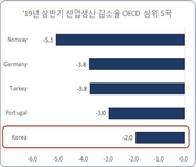 [산업경제뉴스 박진경 기자] 한국 경제에 적신호가 켜졌다는 보고는 이미 많이 나왔지만, 생산⋅수출⋅투자⋅고용 등 주요 경제 지표의 구체적인 수치가 OECD 하위권으로 추락했다는 보고서가 나와 재계의 우려가 커지고 있다. 한국경제연구원(이하 한경연)은 OECD 통계 자료를 분석해, 한국 경제의 주요 지표가 OECD국가 가운데 어떤 위치에 있는지 비교한 보고서를 13일 발표했다. 이 보고서에 따르면, 한국의 산업생산은 OECD 국가 가운데 5번째로 많이 감소했고, 수출은 2번째로 많이 감소했다. 고정투자도 터키와 아이슬란드에 이어 3번째로 많이 감소한 것으로 나타났다. 한경연은 이러한 데이터를 근거로 한국경제의 경기침체가 가계부채와 저출산⋅고령화 등 구조적인 경제 주름살로 이어지고 있다면서 경기침체 대응 및 구조개선을 위한 정책마련이 시급하다고 강조했다. ■ 산업생산 감소율 5위, 주가하락률 5위 올해 상반기 우리나라의 산업생산은 전년 상반기보다 2.0% 감소하면서 역성장세를 보였다. 이러한 감소율은 OECD 31 개국 가운데 독일과 포르투갈 등에 이어 다섯 번째로 많이 감소한 수치인 것으로 조사됐다. 또, 2018년 4/4분기 대비 2019년 3/4분기 주가하