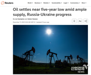 [산업경제뉴스 손영남 기자] 국제 유가가 지정학적 긴장 완화와 경기 둔화라는 상반된 요인이 동시에 작용하면서 하락세를 이어갔다. 러시아와 우크라이나 간 평화 협상이 진전을 보이며 공급 확대 기대가 커진 가운데, 세계 최대 원유 수입국인 중국의 부진한 경제 지표가 수요 감소 우려를 부각시켰다. <로이터>는 17일 이같은 내용을 전하며 국제 유가의 하락 전환을 짚고 나섰다. 보도에 따르면 12월 16일 브렌트유와 WTI 가격은 모두 소폭 하락하며 이러한 흐름을 드러내고 있는 것으로 알려졌다. 실제로 브렌트유는 배럴당 60.32달러로 전일 대비 0.4% 떨어졌고, 미국 서부텍사스산 원유(WTI)는 56.60달러로 0.39% 하락했다. 이는 시장이 러시아 제재 완화 가능성에 따른 공급 증가 기대와 중국 경기 둔화로 인한 수요 감소 우려를 동시에 반영한 결과다. 로이터는 이런 시장 흐름을 이끈 주요인으로 러시아-우크라이나 협상 진전을 꼽았다. 전쟁 종전에 따른 제재 완화 가능성의 상승이 러시아산 원유의 증산을 이끌 지도 모른다는 기대감 때문이라는 것. 리시아산 원유가 다시 국제 시장에 더 많이 공급될 수 있다는 전망은 투자자들에게 가격 하락 압력으로 작용했