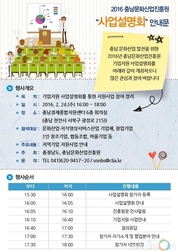 (미디어온) 충남문화산업진흥원은 충남도와 함께 ‘2016 충남문화산업진흥원 기업지원 사업설명회’를 오는 24일 오후 4시, 충남북부상공회의소 6층에서 개최한다고 밝혔다. 설명회와 함께 네트워킹 시간을 마련해 기업 애로사항 접수와 참가자들 간의 교류협력의 장을 제공한다고 밝혔다. 도내 문화산업 및 지식영상서비스산업 등 창조문화산업분야 중소기업, 소상공인, 청년CEO, 예비창업자 등이 참여 가능한 진흥원의 기업지원 사업에 대한 정보들을 제공한다. 도비 약 6억원이 투입되는 올해 진흥원 기업지원 사업들은 △지역특화 문화콘텐츠 개발(국비공모), △지역자원 창작콘텐츠 제작지원(7건), △ICT 문화융합 연구회 및 사업화지원(5건), △전통문화산업 활성화 사업, △이야기가 흐르는 명소 발굴 등으로 구성되어 추진된다. 이번 설명회에서 소개될 주요사업으로는 한국콘텐츠진흥원 공모사업인 지역특화 문화콘텐츠 개발 사업이 대표적이다. 우리 지역의 고유한 문화적 소재를 활용해 글로벌로 진출 가능한 콘텐츠를 제작지원 하는 국비(3~8억 원) 지원사업으로, 지방비(시·군비) 매칭이 가능한 프로젝트를 우리지역 기업이 참여할 수 있게 지원한다. 기타 시제품 제작 및 사업화 지원사업