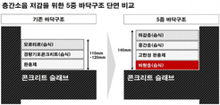 [산업경제뉴스 최기훈 기자] GS건설이 아파트 층간소음을 획기적으로 줄이기 위해 국내 최초로 ‘5중 바닥 구조’를 개발했다. GS건설은 1월 이미 층간소음 1등급 성적서를 받은 바닥구조를 개발한 바 있다. 5중 바닥 구조는 이를 보강해 층간소음 저감 효과를 더욱 높이고, 대규모 현장 시공이 가능한 품질 시공성까지 확보한 점이 특징이다. GS건설은 18일 GS용인기술연구소 친환경건축연구팀이 아파트 단위세대 바닥 마감에서 바탕층과 중간층, 마감층 등 3번의 습식공정을 적용함으로써 5중 바닥 구조를 실현, 층간소음을 줄이는 기술을 개발해 특허를 출원했다고 밝혔다. 층간소음 방지를 위해 3중의 습식 바닥 공법을 적용한 5중 바닥 기술은 국내에서는 처음으로 개발된 것이다. 이로써 정부가 8월 발표한 강화된 층간소음 규정에 맞춘 국내 최고 수준의 층간소음저감 기술을 확보하는데 한걸음 다가서게 됐다. 현재까지는 세부 검사 기준이 마련되지 않아 국내 건설사 중 새로운 층간소음 규정에 맞춘 공인인정서를 인증 기관(LH 및 한국건설연구원)에서 받은 곳은 아직 없다. 이번에 개발된 5중 바닥 구조는 콘크리트 슬라브 위 바닥마감두께를 기존 110~120mm에서 140mm 수준으로