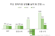 [산업경제뉴스 문성희 기자] 그동안 우리 경제를 떠받치던 반도체와 건설 산업이 하락세로 전환하면서 올해 성장률이 지난해 2.7%보다 0.3%포인트 하락한 2.4%가 될 것이라는 전망이 나왔다. 우리 수출의 30%를 차지하던 반도체 산업은 국제 반도체 가격이 하락하면서 수출액수가 줄어들고, 지난 3~4년 '주택 열풍'이 불면서 국내 신규 투자를 이끌어 온 건설산업은 그동안의 과다 공급과 정부의 잇따른 억제정책으로 투자가 크게 둔화될 것이라는 분석이다. ■ GDP성장률 0.3%p 감소, 건설투자 -5.0%, 수출수지 5.1%p 감소 한국경제연구원(이하 한경연)이 전망한 올해 우리경제의 GDP 성장률은 2.4% 수준이다. 지난해 기록한 성장률 2.7%보다 0.3%포인트 낮아졌다. GDP성장률은 2017년 3.1% 였는데 2018년에는 0.4%포인트 감소했다. 한경연의 올해 전망이 맞다면 GDP 성장률은 3년 연속 감소하는 모습이 된다. 다만 감소폭은 지난해보다 0.1%포인트 작아졌다. 이렇게 경제성장률이 둔화되는 것은 수출과 투자의 감소가 가장 큰 원인으로 지목됐다. 수출 증가율은 2017년 2.0%에서 2018년 3.9%로 지난해에는 증가세가 커졌지만 올해는 2