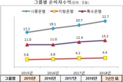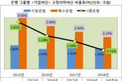 [산업경제뉴스 김소산 기자] 지난해 국내 시중은행이 지난해 벌어들인 순이자수익(이자수익-이자비용)은 22.7조원으로 3년 전보다 32.4% 증가한 것으로 나타났다. 산업경제뉴스가 KB국민은행, 우리은행, 신한은행, KEB하나은행, SC제일은행, 한국시티은행으로 대표되는 국내 시중은행들과 특수은행, 지방은행으로 분류되는 그룹별 순이자수익(이하, 이자수익)을 은행연합회 자료를 토대로 최근 3년간 증가세를 분석해 봤다. 그 결과, 시중은행이 그룹별 증가율에서 32.4%로 가장 높은 성장세를 기록한 것으로 조사됐다. 한국산업은행, IBK기업은행, 한국수출입은행, NH농협, SH수협은행 대표되는 5개 특수은행의 지난해 순이자수익은 13.2조원이었다. 또한, 대구·부산·광주·제주·전북·경남은행으로 대표되는 6개 지방은행의 이자수익은 4.4조원으로 집계됐다. 이를 그룹별로 3년 전(2015년)과 비교한 증가율에서는 시중은행이 32.4%원, 이어서 지방은행이 21.3%, 특수은행 19.4% 순으로 증가했다. 이자수익의 그룹별 변화를 보면, 시중은행은 2015년 17.2조원 → 2016년 19.1조원 → 2017년 20.7조원 → 2018년 22.7조원으로 매년 지속적 증가