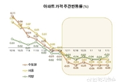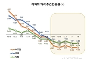 [산업경제뉴스 문성희 기자] 정부가 대출 고삐를 조이면서 급락세를 보이던 집값 하락률이 최근 한 달 동안 옆걸음질을 치고 있다. 지난주에는 변동률이 한 주 전과 동일하게 나타나면서 시장에서는 하락세가 멈췄다는 목소리가 나온다. 한국부동산원에 따르면, 지난주 전국 아파트가격 주간변동률은 -0.05%로 한 주전과 동일한 수치를 보였다. 서울은 -0.04%, 수도권 -0.06%, 지방 -0.04%를 나타냈는데, 모두 한 주 전인 1월 1일 조사한 수치와 동일했다. 주택가격은 지난 10월 정부가 대출규제를 강화하면서 급락세를 보였다. 10월 16일 0.10% 내외의 변동률을 보이며 지난해 초 가격상승 시기에 가까운 상승세를 보였던 가격추이가 급박하게 우하향 추세를 보이더니 한 달만에 하락세로 전환됐다. 하지만 12월에 들어서면서 서울과 지방은 -0.03% ~ -0.04%, 수도권은 -0.05 ~ -0.06%의 변동률을 보이며 한달 째 박스권안에서 횡보를 하고 있는 모습이다. ■ 대전, 과천 상승세 전환...상승지역 23곳 → 25곳 한편, 이렇게 전국이 박스권에서 횡보를 하고 있는 가운데, 대전과 과천은 지난주 상승세로 전환되는 모습을 보이며 반전의 기대감을 시장에